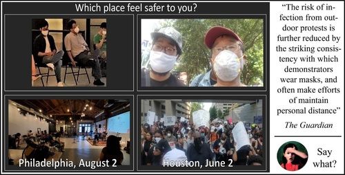 However, an opinion piece by that title posted in “The Guardian” on June 18 must have been written by someone who never walked in these marches. After correctly pointing out that coronavirus is likely to spread more widely in indoors than outdoors, the writer said incredulously, “The risk of infection from outdoor protests is further reduced by the striking consistency with which demonstrators wear masks, and often make efforts of maintain personal distance.” Really?